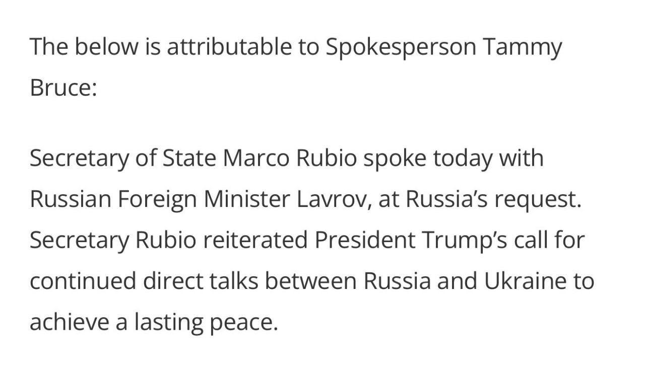 U.S. Secretary of State Marco Rubio spoke earlier with Russian Foreign Minister Lavrov, at Russia’s request, discussing the situation in Ukraine and President Trump’s call for continued direct talks between Russia and Ukraine.